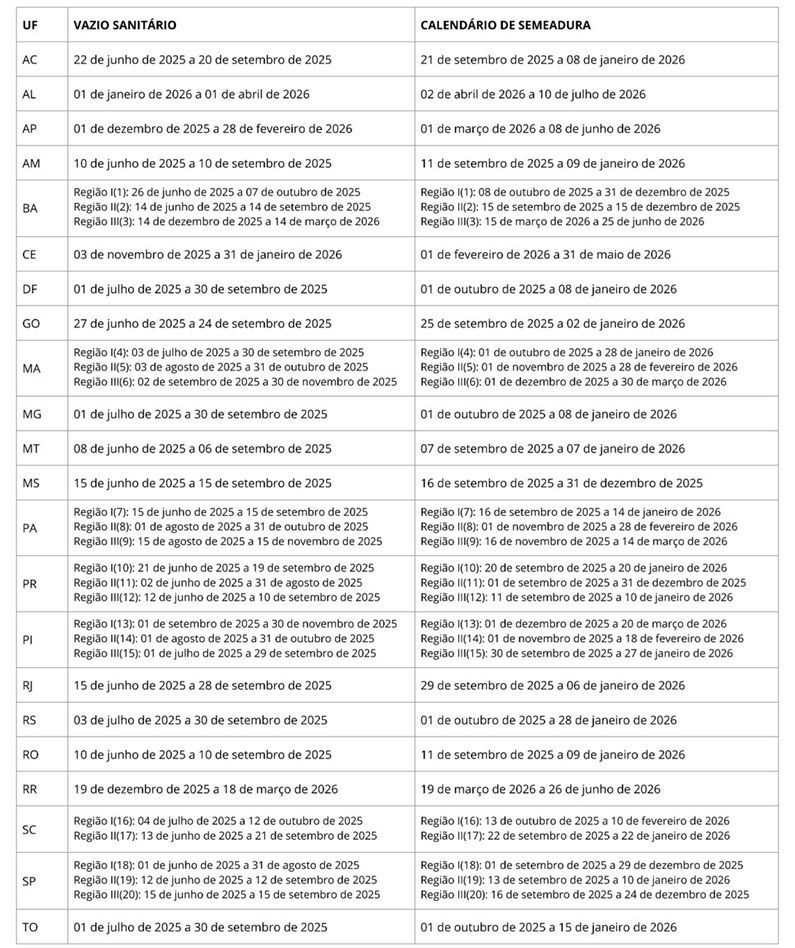 Calendário de vazio sanitário e semeadura. Fonte: Ministério da Agricultura e Pecuária (MAPA, 2025). Image title: planejamento da safra de soja